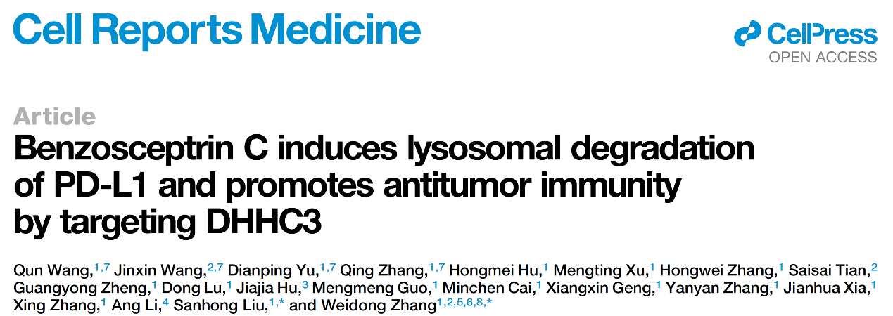 近日,开云电竞官网下载安卓刘三宏和海军军医大学张卫东团队在Cell Reports Medicine发表海洋天然小分子Benzosceptrin C通过靶向DHHC3降解PD-L1发挥免疫抗肿瘤方面的最新研究成果Benzosceptrin C induces lysosomal degradation of PD-L1 and promotes antitumor immunity by targeting DHHC3。
