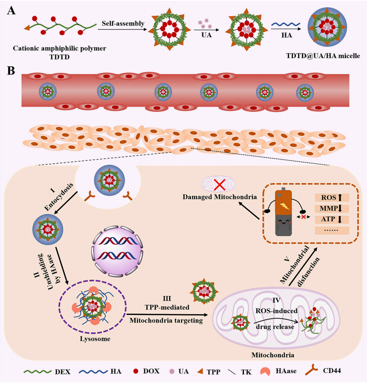 基于该发现,研究团队以天然多糖为基础构建具有线粒体靶向、活性氧敏感双重功能的纳米平台(TDTD@UA/HA),用于同时递送熊果酸和阿霉素。所构建的TDTD@UA/HA纳米胶束能够降低耐药乳腺癌细胞的生存率,抑制耐药乳腺癌细胞的增殖能力,诱导乳腺癌耐药细胞凋亡,提高盐酸阿霉素对耐药肿瘤的抑瘤效率。该研究为天然化合物与化疗药物共递送问题提供参考,也为从调控细胞器功能角度克服肿瘤耐药问题提供思路与借鉴。