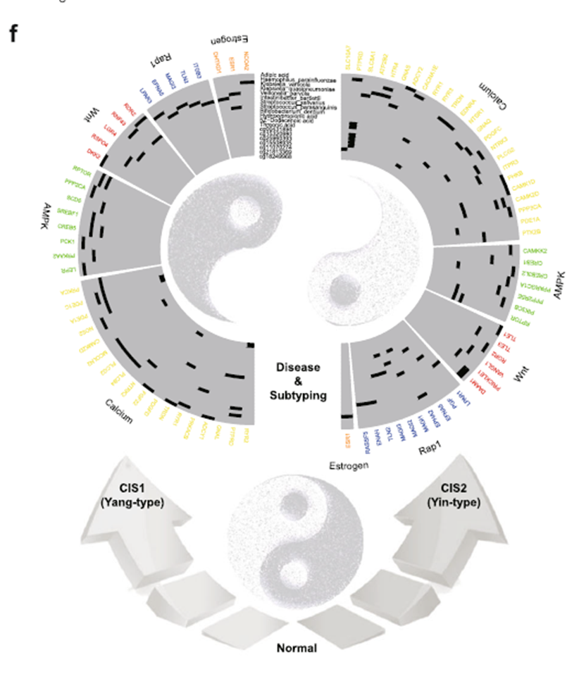 该项研究首先构建了OP的三观全景式图谱,详细展示了OP在各个尺度的病理表现。然后利用联合课题组开发的深度隐空间融合算法(deep latent space fusion,DLSF),发现OP宏观的核心临床指标区分度明显,并且在分子层面可以进一步分为两个组群。进一步观察两组在服用钙制剂后2年的骨密度变化,并结合中医阴阳表型组学思维模式,将随访结果进行归类,发现一组人群骨密度显著升高,而另一组人群几乎没有变化或骨密度进一步减低,由此命名为OP“临床干预相关的亚型”(clinical intervention relevant subtypes,CISs),其中对钙制剂使用敏感骨密度获益高的为CIS1型,即阳型;对钙制剂使用不敏感获益不显著的为CIS2型,即阴型。确立阴阳分型后,进一步解释其背后的机制基础,利用全基因组模型(Omnigenic Theory)和xQTL算法进行跨尺度关联映射,发现阳型OP组的分子响应活跃,Estrogen、AMPK等信号通路激活上调;阴型OP组则完全相反,钙信号通路呈现大规模抑制。CASR、NFATC1等基因多态性结果也支持上述发现。