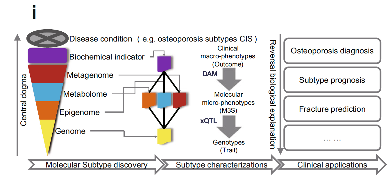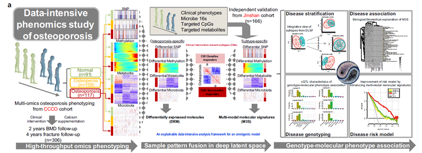 针对以上问题,该研究团队历时5年主导了一项迄今最大规模的单中心多组学OP前瞻性队列研究。利用2019年纳入366例志愿者宏观(饮食、运动、生活习惯、环境状况、合并患病、中药使用情况等),中观(骨代谢、钙磷代谢、内分泌等)和微观(基因组、表观遗传组、宏基因组、代谢组)表型组、基因组数据建立数据集,并持续跟踪获取了2年和4年的随访数据,验证集还同步纳入了166例志愿者。