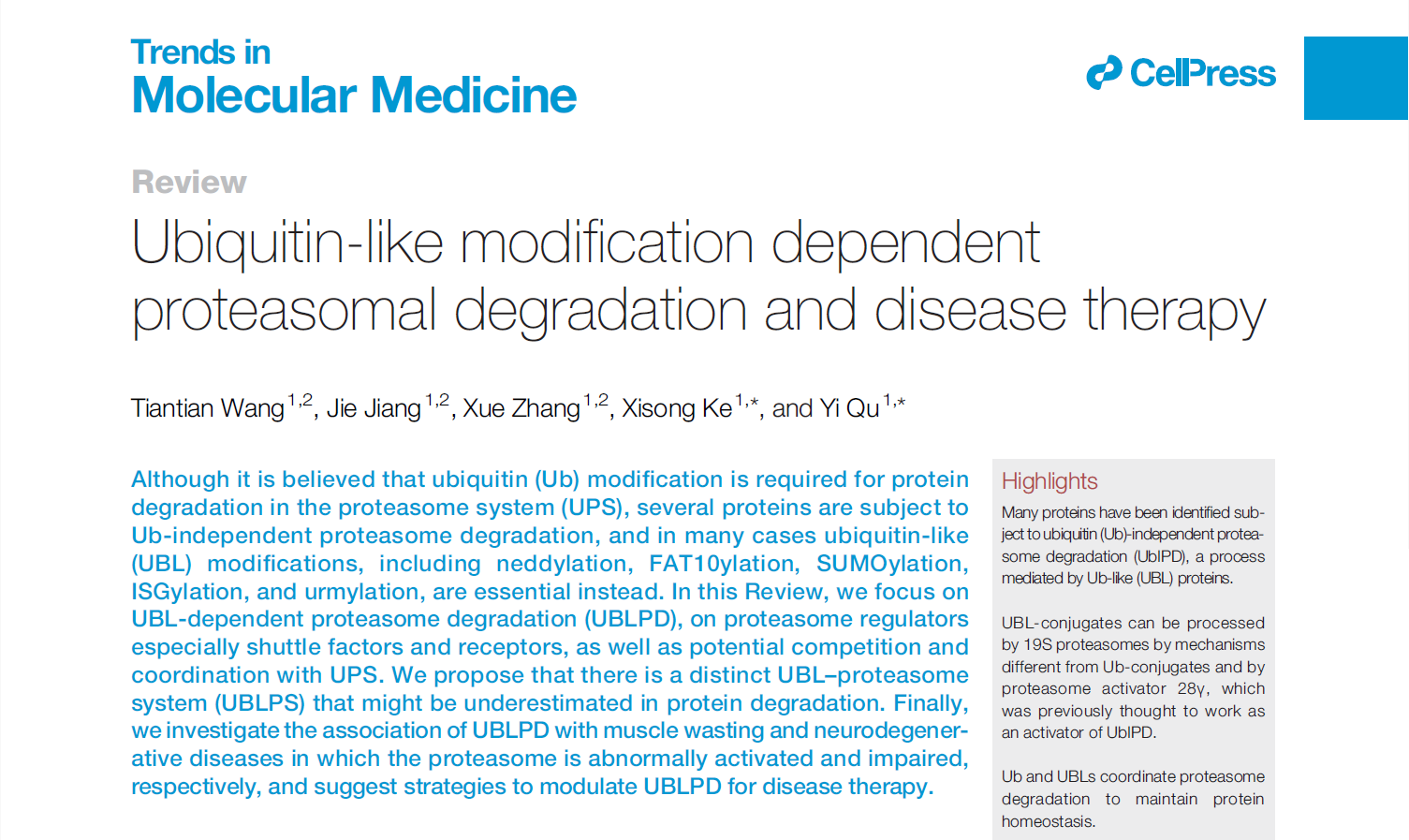 近日,我校交叉科学研究院柯细松团队提出了类泛素化依赖的蛋白酶体降解途径(UBLPD)及其在疾病发生发展中的作用,为全面理解蛋白酶体系统和开发蛋白降解相关药物提供了一个全新视角。相关论文以Ubiquitin-like modification dependent proteasomal degradation and disease therapy为题发表于Cell Press综述系列期刊Trends in Molecular Medicine。