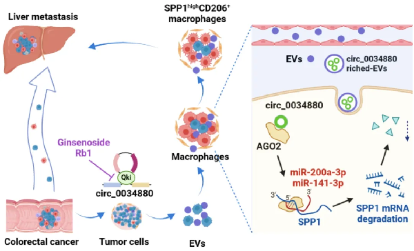 在肿瘤进展过程中,肿瘤来源的细胞外囊泡(TEVs)负责原发肿瘤细胞与远端器官中免疫细胞或基质细胞之间的信息传递,其往往作为先头兵,为肿瘤细胞定植和转移后的继发性生长创造有利的肿瘤微环境(TME)。团队在早期发表的Nat Commun杂志中已经表明,富含各类蛋白质、脂类、RNA、DNA等内容物的TEVs对结直肠癌转移前生态位的形成和肿瘤进展有着十分重要的影响。在本次研究中,团队首次发现富含circ-0034880的TEVs可通过激活SPP1highCD206+促肿瘤型巨噬细胞促使CRLM的形成,而来自中医药宝库的天然产物人参皂苷Rb1则可以通过阻断SPP1highCD206+促肿瘤型巨噬细胞的激活来抑制CRLM形成,这为中医药天然药物的临床转化提供了可靠的科学依据。