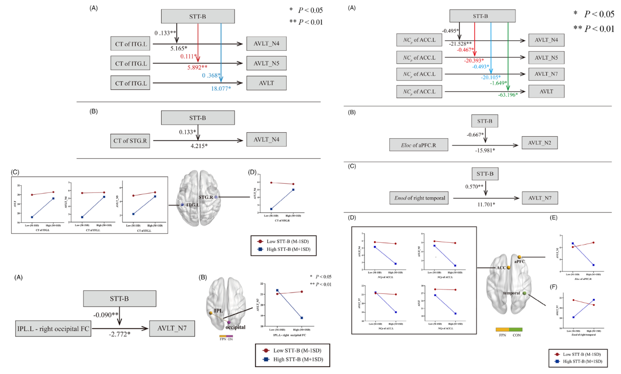 aMCI作为痴呆的前驱阶段,表现为情景记忆障碍。尽管多模态脑影像学研究在一定程度上揭示了情景记忆障碍与大脑重塑的关系,并为神经调控提供了潜在靶点,但为了进一步突破疗效瓶颈,探索调节情景记忆与脑重塑关系的新途径迫在眉睫。本研究以aMCI患者和健康人群为研究对象,分析脑区、连接和网络三个层面的大脑重塑变化,并探讨了IPS在情景记忆中的调节作用。研究结果表明,aMCI患者的大脑重塑在这三个层面均有显著改变,而IPS在即时/延迟回忆、再认功能与脑结构/功能特征的相关性中起到了关键调控作用。这一发现强调了IPS对情景记忆表现的重要性,并提示在制定aMCI患者的认知康复方案时,引入IPS的干预可能具有潜在临床意义。