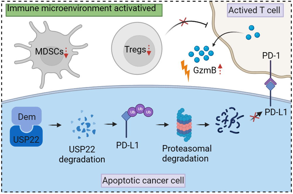 我校刘三宏和海军军医大学张卫东课题组长期致力于从天然活性产物中寻找作用机制新颖的肿瘤免疫治疗小分子药物。研究人员从一个包含225个中药小分子的化合物库中发现去甲泽拉木醛(Dem)可以显著下调结直肠癌细胞中PD-L1的表达,并增强T细胞对肿瘤细胞的杀伤作用。机制研究表明,Dem与去泛素化酶USP22结合并促进其降解,从而增加PD-L1的泛素化并通过蛋白酶体途径引起其降解。此外,Dem增加了细胞毒性T细胞的活性,减少了肿瘤浸润淋巴细胞(TILs)中髓源性抑制细胞(MDSCs)和调节性T细胞(Tregs)的数量,从而激活了C57BL/6小鼠的肿瘤免疫微环境并抑制了皮下移植瘤的生长。研究还发现Dem和CTLA-4抗体的组合可以进一步提高抗肿瘤治疗的疗效。该研究揭示了Dem促进PD-L1降解的机制,并表明Dem和CTLA-4抗体的联合可能提高免疫治疗的疗效。这项创新性研究为Dem作为潜在的肿瘤免疫治疗小分子药物的开发提供了坚实的科学基础。