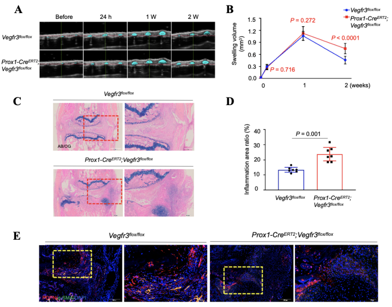 该研究发现,腰椎间盘突出症患者突出髓核组织中出现大量以毛细淋巴管为主的新生淋巴管。在小鼠髓核突出模型中同样出现明显的淋巴管新生,且突出的髓核细胞经椎旁淋巴管回流至引流淋巴结进行清除,在1周后突出的髓核组织基本消失,而与髓核突出有关的炎性细胞浸润在1周时达到峰值,随后逐渐减轻。通过构建淋巴管内皮细胞上条件性敲除Vegfr3基因的小鼠,发现小鼠椎旁淋巴管生成障碍,从而限制了突出髓核的清除,并加重了椎间盘的炎症进展。该研究揭示了椎旁淋巴管系统在促进髓核突出重吸收及炎症消退中的重要作用。