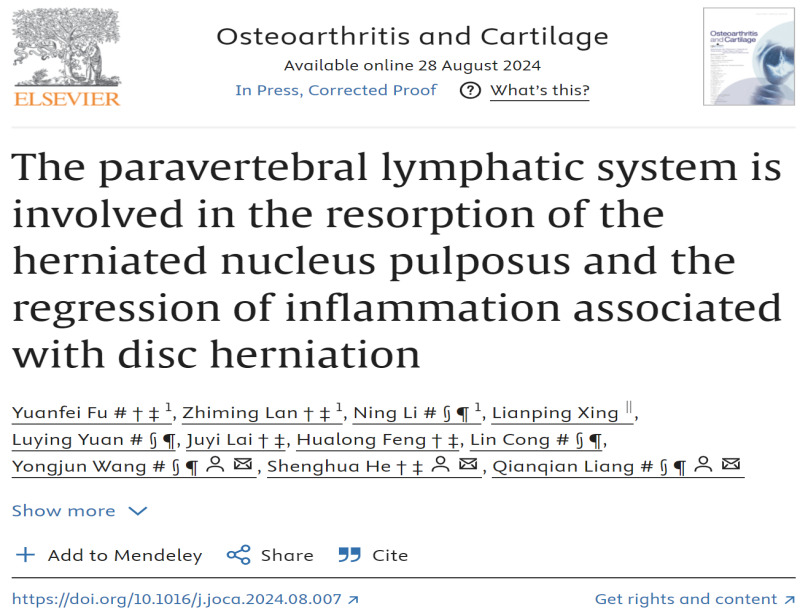 近日,脊柱病研究所所长梁倩倩研究员、王拥军教授联合深圳市中医院何升华主任医师在骨科领域Top期刊Osteoarthritis and Cartilage发表The paravertebral lymphatic system is involved in the resorption of the herniated nucleus pulposus and the regression of inflammation associated with disc herniation研究论文,首次揭示椎旁淋巴管系统参与椎间盘突出过程中髓核突出重吸收及炎症消退的作用机制。