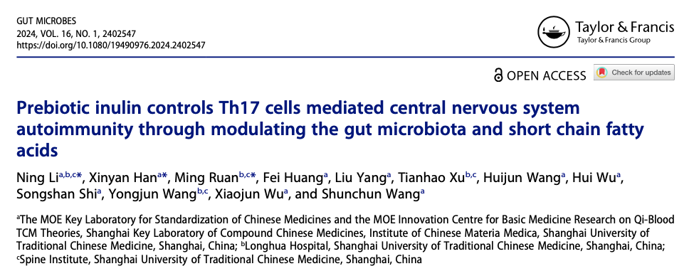 近期,我校中药研究所王顺春研究员、吴晓俊研究员联合龙华医院和脊柱病研究所王拥军教授团队在Gut Microbes杂志发表了题为Prebiotic inulin controls Th17 cells mediated central nervous system autoimmunity through modulating the gut microbiota and short chain fatty acids的研究成果,发现中药中广泛存在的菊糖类多糖可以调控“肠-菌群-脑”轴,有效改善自身免疫性脑脊髓炎小鼠症状,证实罗伊氏乳杆菌和丁酸是菊糖发挥免疫调节作用的关键,揭示菊糖作为益生元和罗伊氏乳杆菌作为益生菌在改善多发性硬化症中的潜在益处。