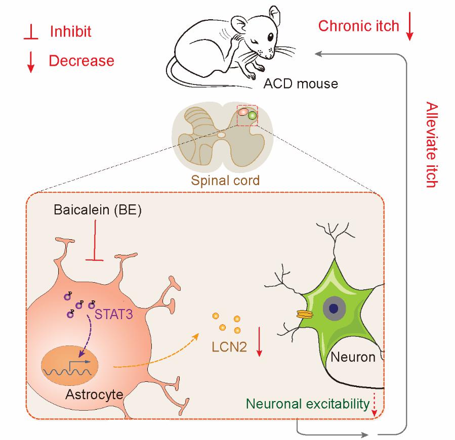 近日,我校中西医结合学院王志菲研究员团队在Acta Pharmacologica Sinica上发表了题为Baicalein ameliorates chronic itch in ACD mice by suppressing the spinal astrocytic STAT3–LCN2 cascade的研究成果。该研究阐明黄芩素(Baicalein, BE)通过抑制脊髓星形胶质细胞STAT3–LCN2通路缓解小鼠慢性痒的作用机制,揭示了黄芩素治疗慢性痒的重要药用价值,为慢性痒治疗方法的开发提供重要科学依据。