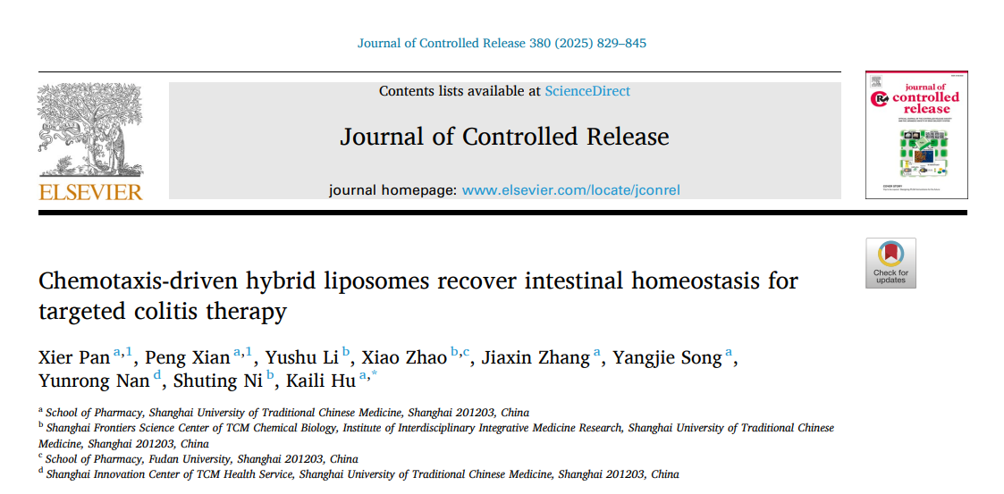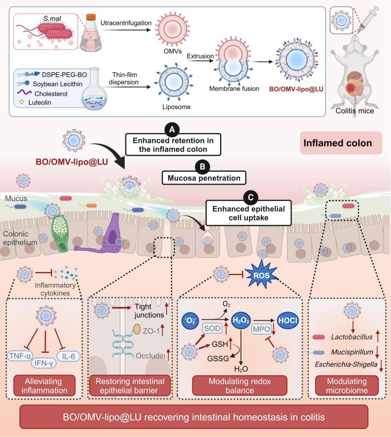 近日,我校中药学院胡凯莉团队通过构建冰片修饰细菌外膜囊泡融合脂质体(BO/OMV-lipo@LU),实现了木犀草素向炎症结肠部位的口服靶向递送,有效修复肠道稳态,提高了木犀草素对结肠炎的治疗效果。研究成果Chemotaxis-driven hybrid liposomes recover intestinal homeostasis for targeted colitis therapy发表在药剂学领域权威国际期刊Journal of Controlled Release。
