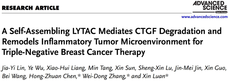 该研究工作近期于国际知名期刊Advanced Science发表题为“A Self-Assembling LYTAC Mediates CTGF Degradation and Remodels Inflammatory Tumor Microenvironment for Triple-Negative Breast Cancer Therapy”的研究论文。我校研究生林佳谊和吴也副研究员为论文第一作者,栾鑫研究员、张卫东教授和陈红专教授为论文通讯作者。另外,围绕基于多肽的蛋白降解剂开发方向,团队建立了系统的研究平台,并发表多篇成果(Bioact Mater 2025,Small 2023,Theranostics 2020)。