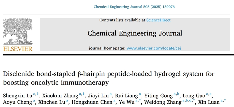 该工作近期以“Diselenide bond-stapled β-hairpin peptide-loaded hydrogel system for boosting oncolytic immunotherapy”为题,在国际化学知名期刊Chemical Engineering Journal发表研究成果。我校研究生卢盛鑫和张笑堃为论文第一作者,栾鑫研究员、张卫东教授和吴也副研究员为论文通讯作者。