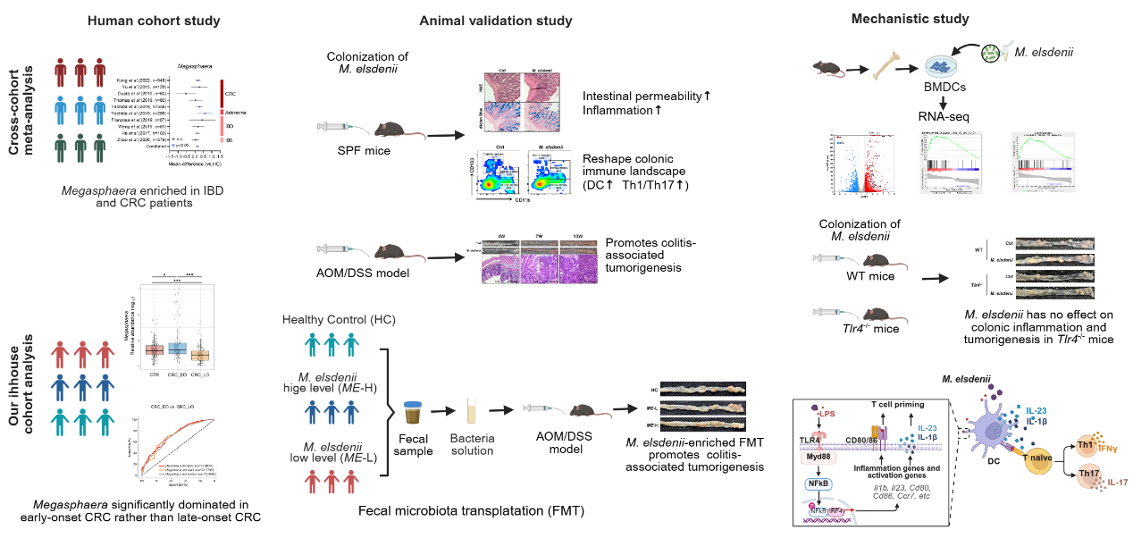 团队首先从已发表的多组临床队列中发现肠道菌属Megasphaera在炎症性肠病(IBD)及结直肠癌(CRC)中明显富集。随后,通过Megasphaera elsdenii (M. elsdenii)单菌定植实验发现M. elsdenii能够重塑小鼠结肠黏膜固有层免疫细胞群,诱导树突状细胞(DC)成熟,并促进促炎性Th1及Th17细胞分化,加重结肠炎性反应。在机制上,M. elsdenii通过LPS/TLR4/IRF4通路诱导DC细胞成熟。进一步在AOM/DSS炎性肠癌发生模型中,证实M. elsdenii诱导DC细胞成熟,促进Th1及Th17细胞分化,进而加重炎性肠癌肿瘤负荷,并且在Tlr4-/-小鼠中证明这种促癌机制依赖于TLR4介导。最后,依托复旦大学附属肿瘤医院结直肠癌人群队列,团队发现肠道菌属Megasphaera尤其在早发型结直肠癌(年龄<50岁)富集更为明显。通过采用高表达M. elsdenii结直肠癌患者粪菌移植,证实M. elsdenii丰度高的肠癌患者粪菌移植加重AOM/DSS小鼠肿瘤负荷及病理改变,进一步验证了M. elsdenii通过加重肠黏膜免疫炎性反应促进炎性结直肠癌发生。