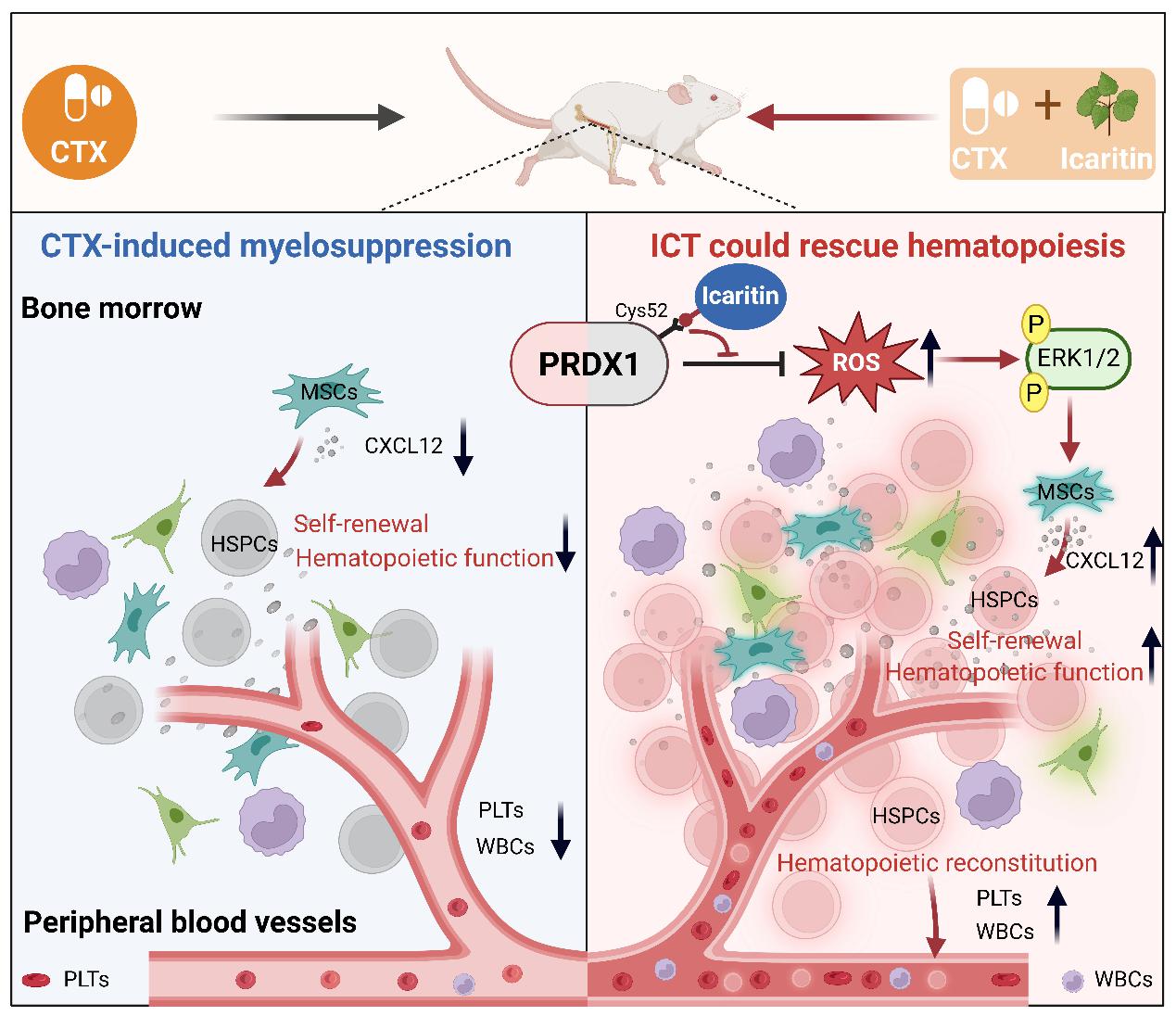 近日,我校交叉科学研究院刘三宏研究员团队联合海军军医大学张卫东教授、中国科学院动物研究所刘峰研究员团队,在Engineering期刊在线发表题为“Icaritin Improves the Hematopoiesis-Supportive Function of MSCs via A PRDX–MAPK Axis After Chemotherapy”的研究论文。该研究不仅揭示中药活性成分淫羊藿素(Icaritin,ICT)可通过靶向调控骨髓造血微环境促进化疗后造血功能恢复,更为化疗所致骨髓抑制防治提供新候选分子及研究范式,同时从现代分子机制层面印证了中医“肾主骨生髓”的经典理论。