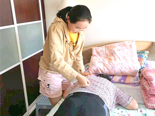 康复医学院2018级康复物理治疗专业学生郭沁琦为奶奶推拿