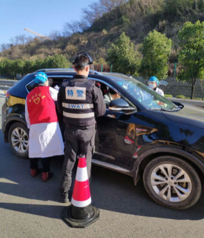 基础医学院2016级中医学(5+3一体化)专业学生胡佳露为过往车辆内人员测量体温