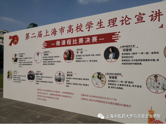 此次比赛分为初赛和决赛。在初赛中,护理学院2018级本科生祁雯倩以“用中医药讲好中国故事”,赢得了评委的一致好评,获得64进25的决赛资格。在9月28日的决赛中,她以“携手一带一路,弘扬优秀传统文化”进入前10名,赢得了来之不易的三等奖。从动员学生申报、填写申请表到初赛和决赛讲稿的修改,何老师倾注了大量的心血。在决赛讲噶修改过程中,马院院长王芳教授以及张菊老师也提出了诸多宝贵意见,王芳教授并代表我校担任评委。这是近年来我院形势与政策教研室坚持不懈推进“大学生讲思政课”社会实践活动成果的体现,也是我院思政课教学改革创新所取得的累累硕果之一。