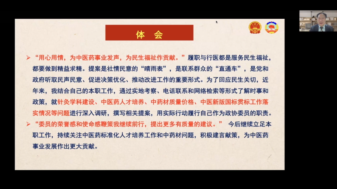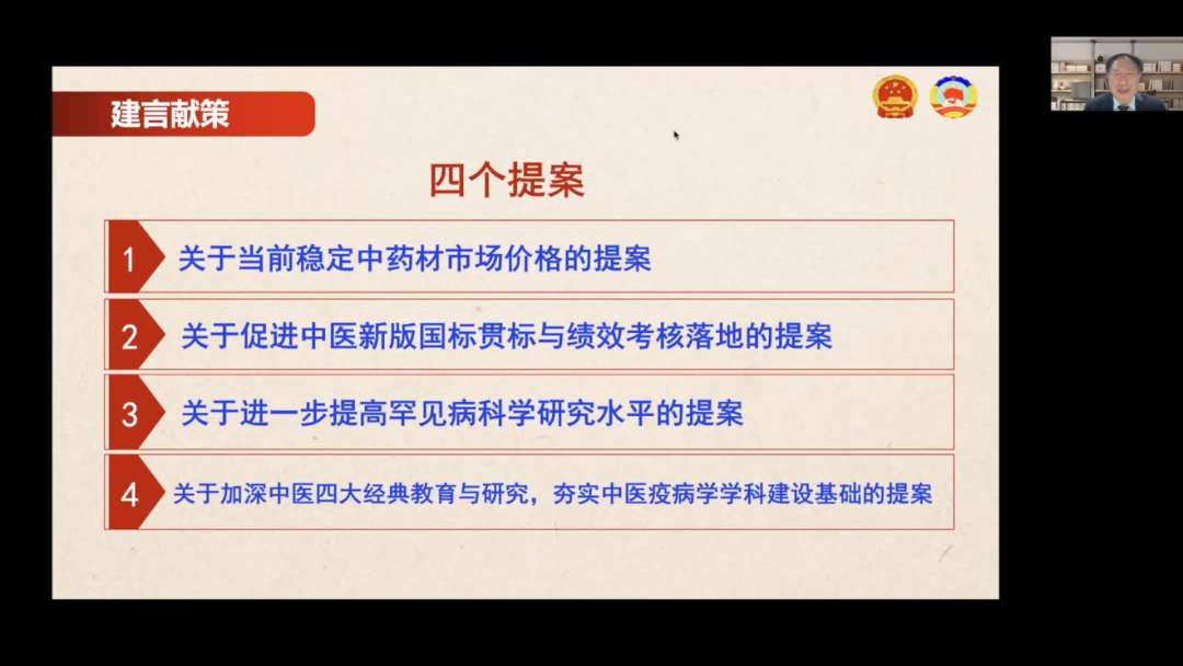 吴焕淦表示,作为一名政协委员,不但要做好两会精神的宣传者,更要做贯彻落实两会精神的实践者、推动者,要“用心用情,为中医药事业发声,为民生福祉作贡献”。吴焕淦向同学们分享了今年两会上提交的“关于当前稳定中药材市场价格的提案”“关于促进中医新版国标贯标与绩效考核落地的提案”“关于进一步提高罕见病科学研究水平的提案”“关于加深中医四大经典教育与研究,夯实中医疫病学学科建设基础的提案”四个提案的具体内容。吴焕淦表示,自己将继续立足本职工作,持续关注中医药标准化、人才培养工作和中药材问题,积极建言献策,为中医药事业发展做出更大贡献。