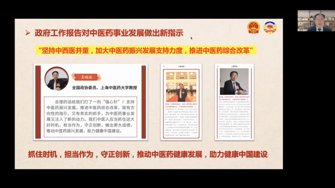 吴焕淦对李克强总理在政府工作报告中有关“坚持中西医并重,加大中医药振兴发展支持力度,推进中医药综合改革”部分的内容进行了深入解读,指出中医界人士备受鼓舞,委员们就如何坚持中西医并重,如何加大中医药振兴发展支持力度,如何推进中医药综合改革等相关问题进行热烈讨论并发表意见,提出要抓住时机,担当作为,守正创新,推动中医药健康发展,助力健康中国建设。