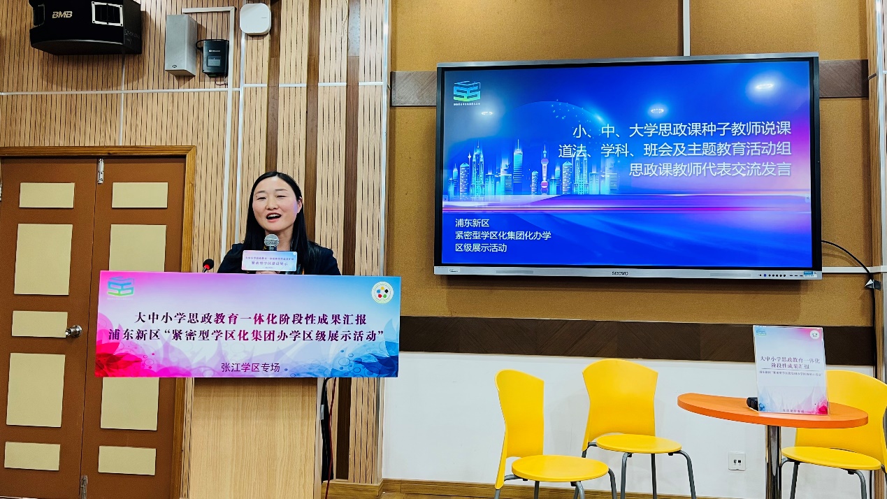 此外,张菊老师在守好一段渠,种好责任田的同时,还推动着同学段的协同育人。她多次参加张江学区大中小思政一体化活动,在集体备课、教学研讨的同时,为孙桥中学和张江高科实验小学两位老师的教学竞赛提供指导,两位老师不仅进入学区十佳种子选手名单,在年终总结会上做教学展示,其教学设计也入选了学区“思政一体化”成果集。