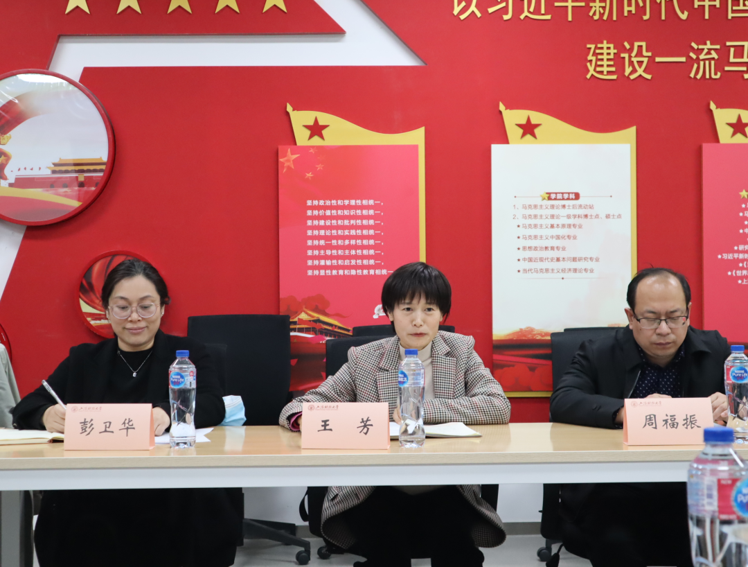 为加强马克思主义理论学科建设,迎接即将到来的学科(位点)评估,3月8日下午,由王芳院长带队,学院各学科方向召集人、学科秘书及习近平新时代中国特色社会主义思想概论教研室全体教师赴上海财经大学马克思主义学院调研学习。