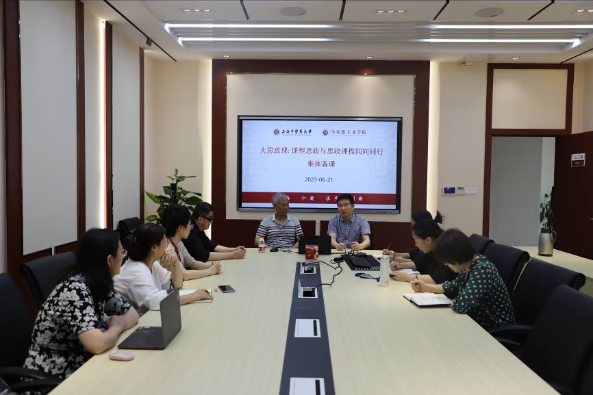 为了贯彻教育部等十个部门印发的《全面推进“大思政课”建设的工作方案》和中共上海市教育卫生工作委员会等十二部门印发的《上海市“大思政课”建设综合改革试验区实施方案》,深入推进课程思政与思政课程的一体化发展,马克思主义学院马克思主义基本原理教研室和“张黎声课程思政工作室”于6月21日上午召开了集体备课会。本次备课会邀请了工作室的张黎声教授、马克思主义学院党总支书记陶思亮以及马克思主义学院部分教师参加。
