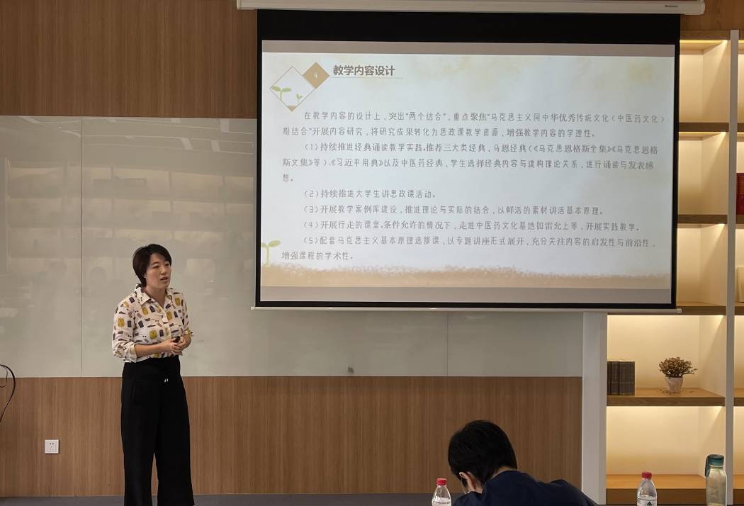科技人文研究院的李明老师,是2023年上海市教学创新大赛一等奖获得者,具有丰富的教学比赛参赛经验,她分享了自己的参赛心得,并从制作PPT、精炼教学知识点、密切关注国家政策等角度对马院老师进行了指导。