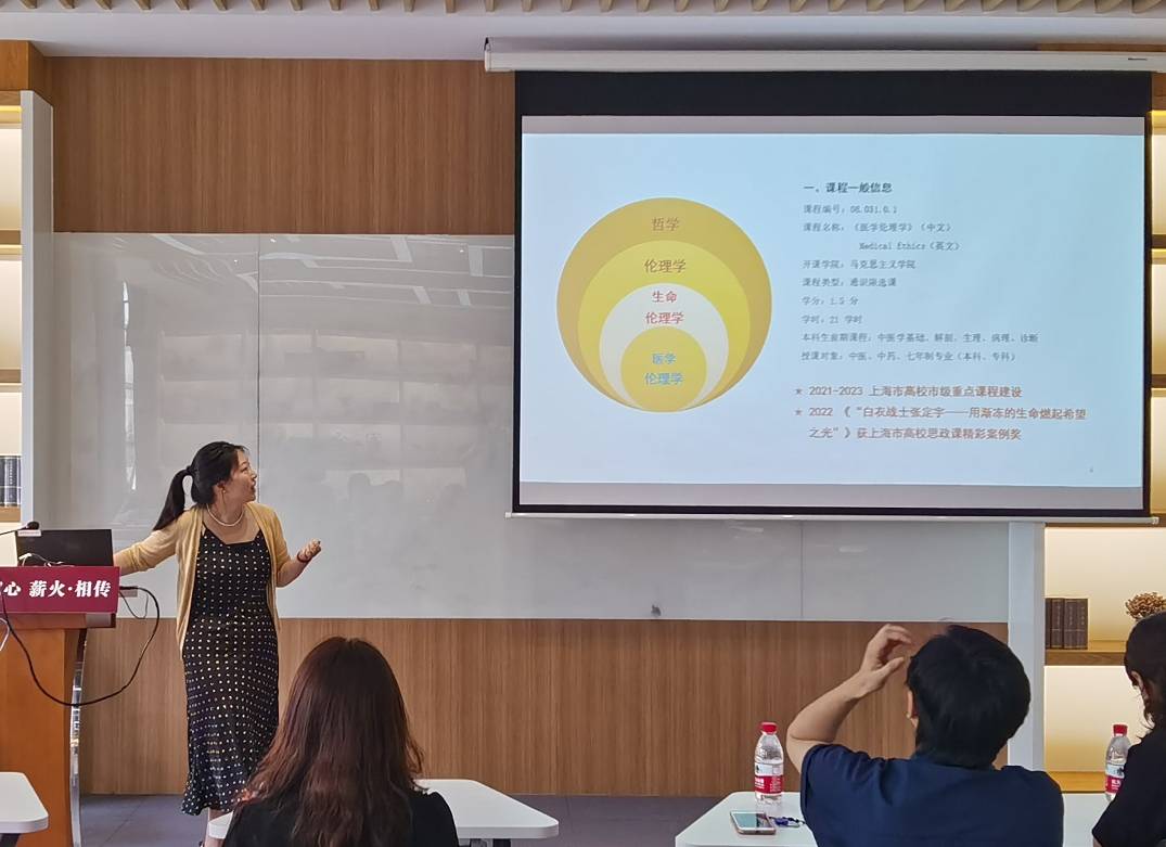 首先,陈瑞萍、钱疏影、蒋吕一和谢朝丹老师分享了“医学伦理学”“马克思主义基本原理”“中国近现代史纲要”以及“习近平新时代中国特色社会主义思想概论”等课程的创新课程设计经验。