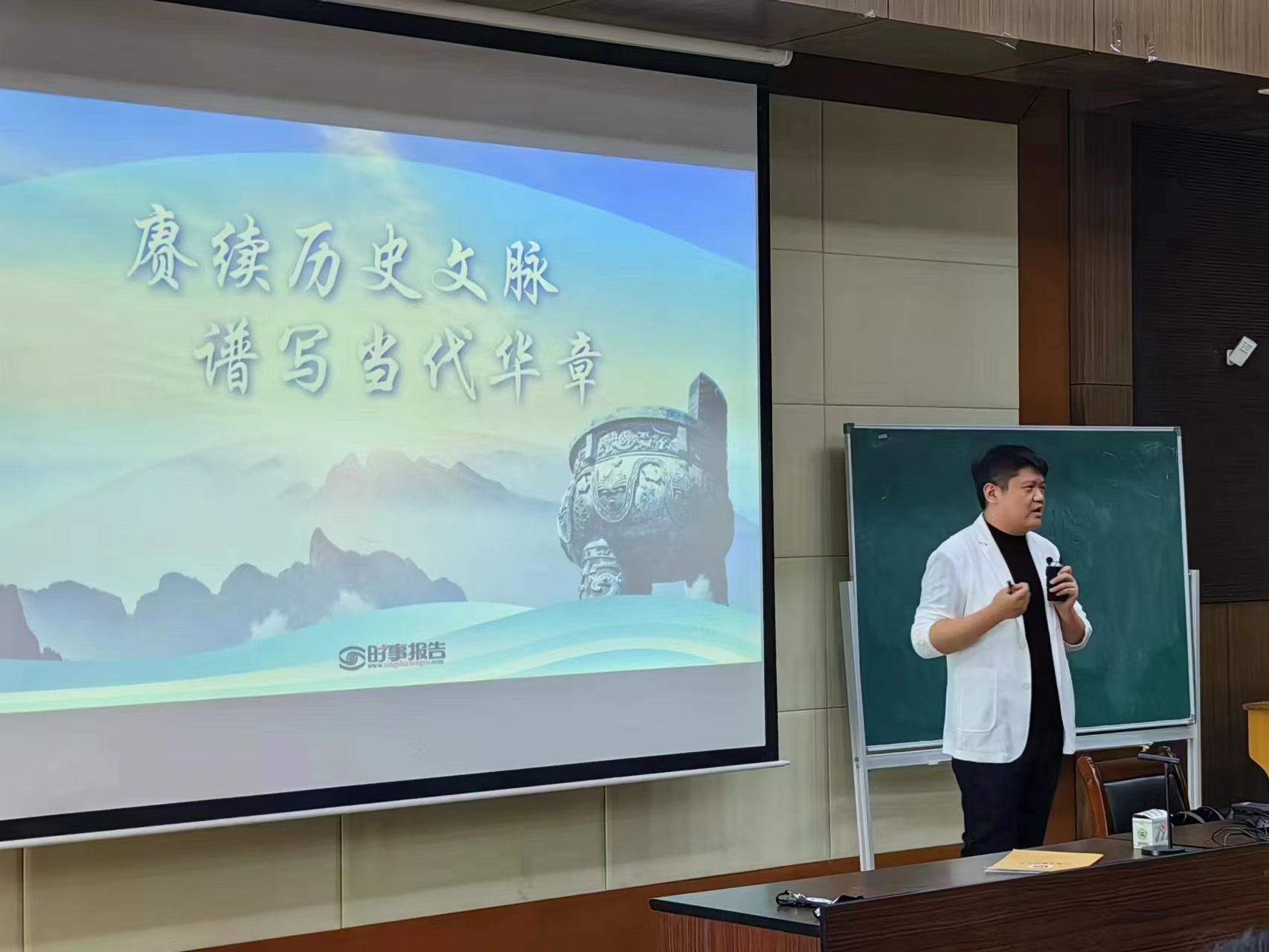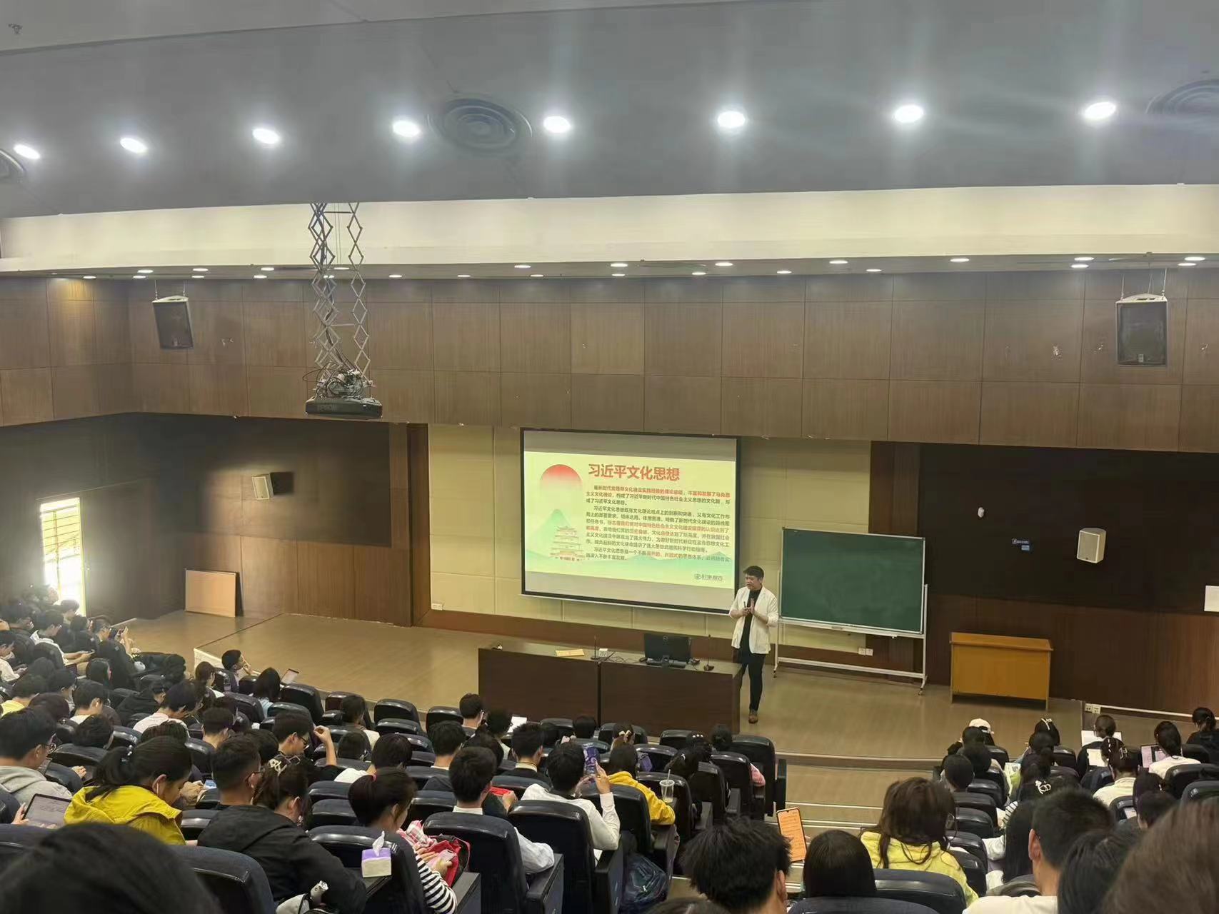 10月20日下午,马克思主义学院邀请上海财经大学马克思主义学院周杰副教授走进“形势与政策”课堂。周杰以“赓续历史文脉谱写当代华章”为题,为250多名本科一年级学生带来了一场生动鲜活的思政课,推进了习近平文化思想进课堂、进学生头脑。
