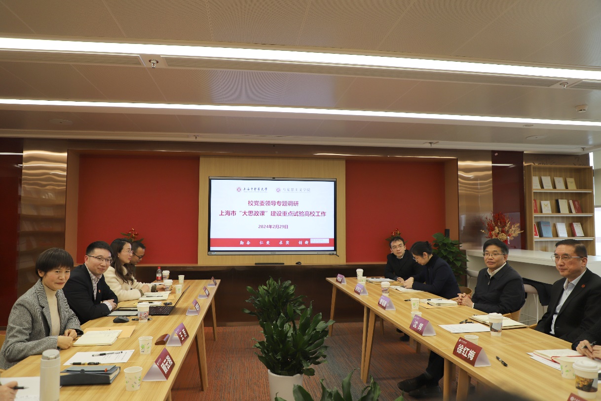 为扎实推进马克思主义学院高质量发展,2024年2月29日下午,校党委书记曹锡康、副书记沈辉带队调研马克思主义学院建设工作。党委校长办公室主任徐红梅、教务处处长张亭立、党委校长办公室副主任吴平、研究生院副院长尹磊淼等职能部门负责人、马克思主义学院领导班子成员、教师代表出席专题调研会。