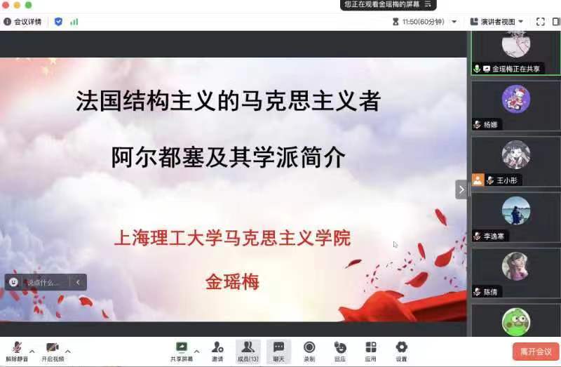 为提高马克思主义学院研究生专业素养,激发学生们研读经典的兴趣与热情,学院特别举办了“杏马学术进展讲座系列”。3月29日晚,上海理工大学马克思主义学院金瑶梅院长应邀在线作《法国结构主义的马克思主义者阿尔都塞及其学派简介》专题讲座。