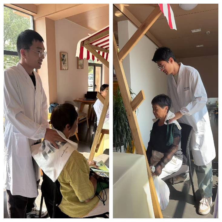 博士研究生王明星在为82岁高龄患者进行颈部推拿治疗时,同步指导老人掌握简易颈部保健操。他在活动后表示:“此次课程实践活动让我深切体会到基层群众对中医药服务的迫切需求。见证患者从痛苦表情到舒展笑容的转变,是医者最大的欣慰。这次经历不仅强化了我的职业使命感,也验证了专业知识的实践价值。”