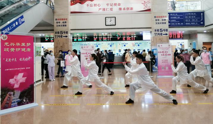 中医养生操具有悠久的历史,其动作简单、缓和,具有强身健体、调整锻炼者的呼吸达到舒畅心情等功效。龙华医院养生功法爱好者们在门诊大厅为患者们带来了一场精彩养生功法快闪,吸引了民众驻足观看学习。