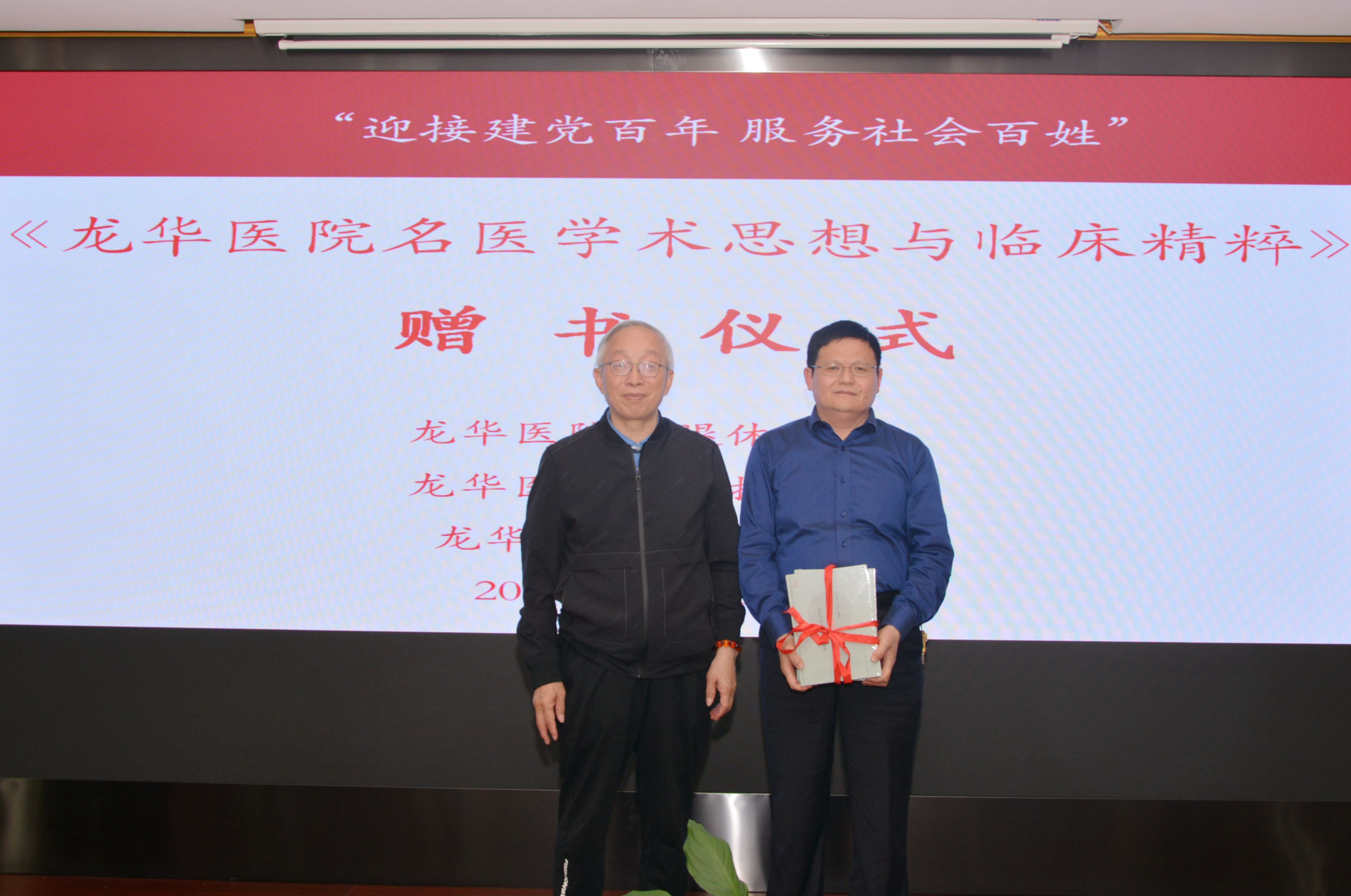 《龙华医院名医学术思想与临证精粹》赠书仪式由沈平主持。仪式上,赵文良介绍医院主要情况,《龙华医院名医学术思想与临证精粹》专著主编徐振晔代表老教授协会向何巧飞赠送50册专著。该专著由龙华医院资深中医临床专家、上海市名中医陈湘君教授和徐振晔教授领衔担纲主编,由我校终身教授施杞、龙华医院党委书记刘胜作序,由龙华医院名中医工作室导师及退休的部分副高级职称及以上专家共46位学者参加编纂撰稿,集中体现了专家们的学术思想、学术理论、学术观点和学术经验,涉及内科、外科、骨伤科、肿瘤科、妇科、儿科、针灸科等各个不同的专业领域的各种疾病病种的临证经验。此次赠送学术专著,代表着老教授协会给金山区中西医结合医院传经送宝,浓浓情意,期望着中医薪火相传、后继有人。老教授协会会长江启中在讲话中殷切鼓励中青年医师一定要拿好接力棒,学习掌握好名老中医的临床学术思想,传承精华,守正创新,为中医药事业的创新发展贡献一份力量。
