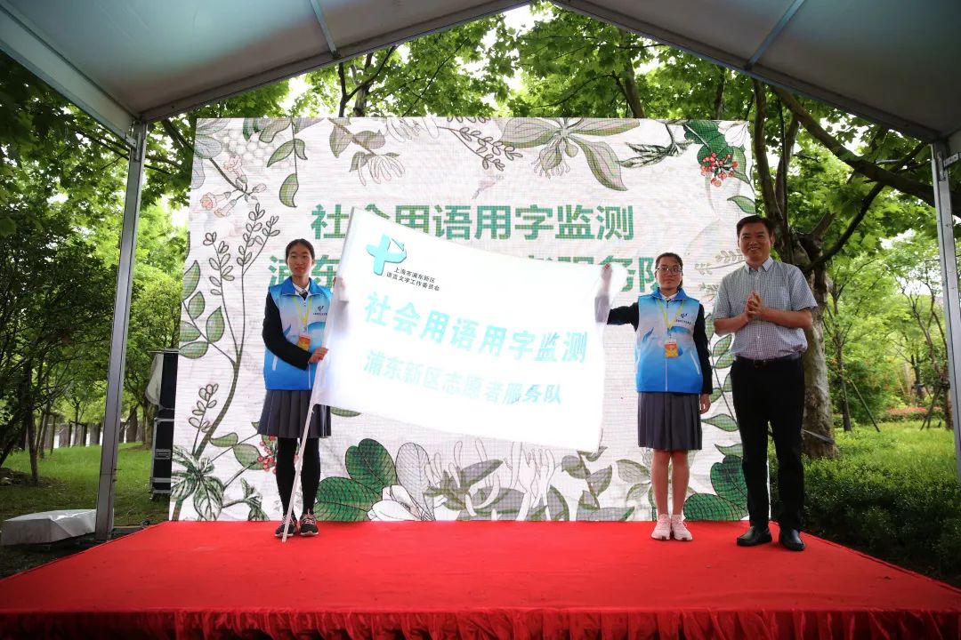 为推广并普及国家通用语言文字,提高学生应用语言文字的能力,自觉传承弘扬中华优秀文化的意识,学校将打造全社会语言文字规范化建设的示范标杆。浦东新区教育局德育处(教材管理处)处长、区语委办主任马春馥向浦东新区社会用语用字监测志愿者服务队授旗。