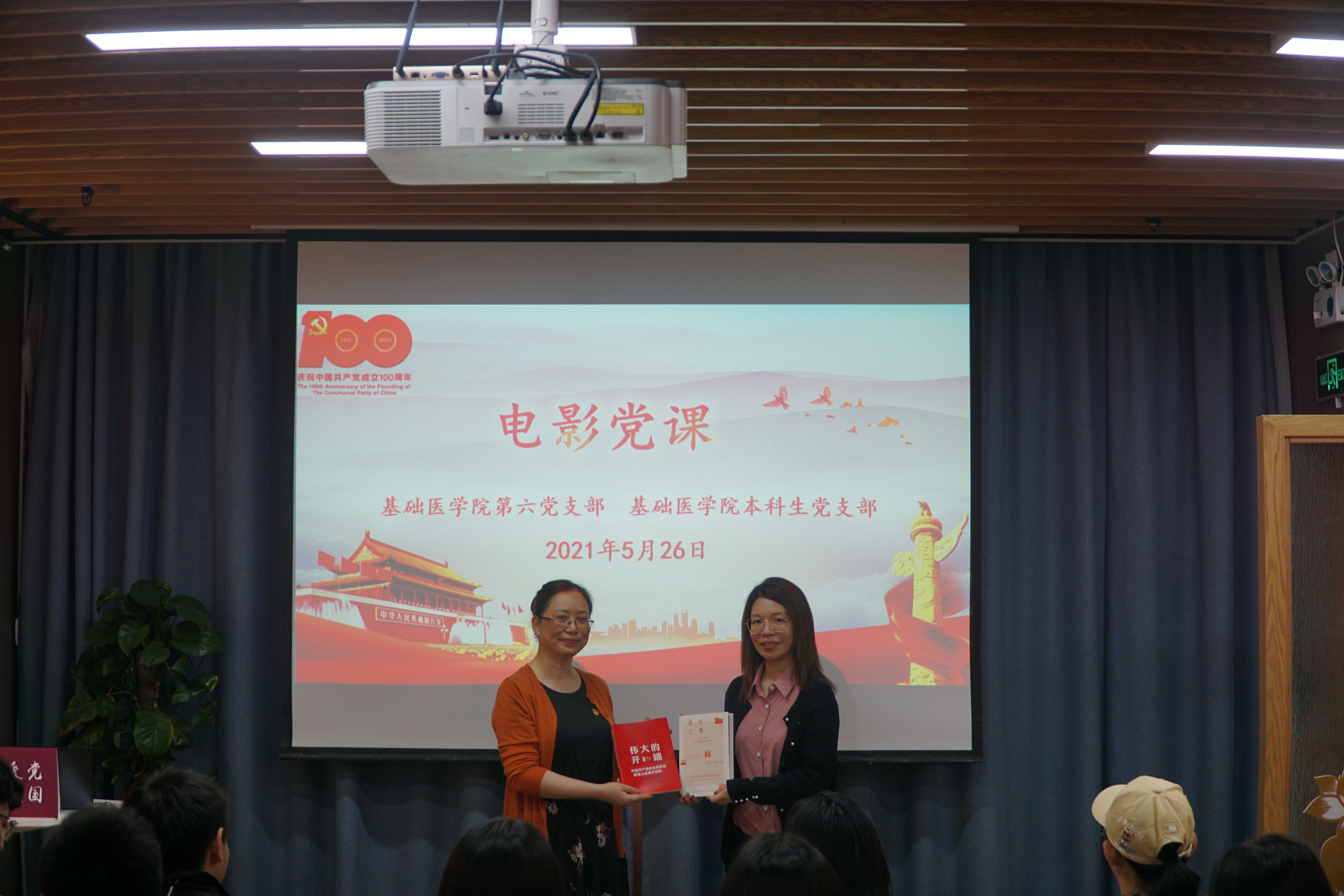 5月26日下午,第六党支部和本科生党支部在党建服务中心共同开启电影党课序幕。党课伊始,教师党员和学生入党积极分子一起组队搭建红色历史模型——中共一大会址、南湖红船、天安门城楼等。接着,第六党支部书记包怡敏为师生们上了一堂微党课,介绍中国共产党历史发展的四个时期,推荐体现党的百年发展历程的十部电影作品,包括展现中国共产党创建时期艰辛历程的《建党伟业》、土地革命战争时期的《长征》、抗日战争时期的《鸡毛信》、再现新中国成立的《建国大业》、纪念抗美援朝70周年献礼片《金刚川》、人民的好书记《焦裕禄》、展现进入社会主义现代化建设时期后我国强大国力和凝聚力的《红海行动》、《我和我的祖国》以及抗疫纪实影片《一起走过》等。这些优秀电影作品反映了各个历史时期我们党领导人民群众为了人民的幸福和国家的昌盛所作出的不可磨灭的贡献和成就。随后,包怡敏代表第六党支部向本科生党支部赠送党史相关书籍《伟大的开端》和《初心之地——上海红色革命纪念地全纪录》,今后师生们将继续共学党史、共赏红色电影、共访红色基地。最后,师生们一起观看了建党90周年献礼片——《建党伟业》,回顾中国共产党在风雨飘摇的年代诞生的艰辛历程。