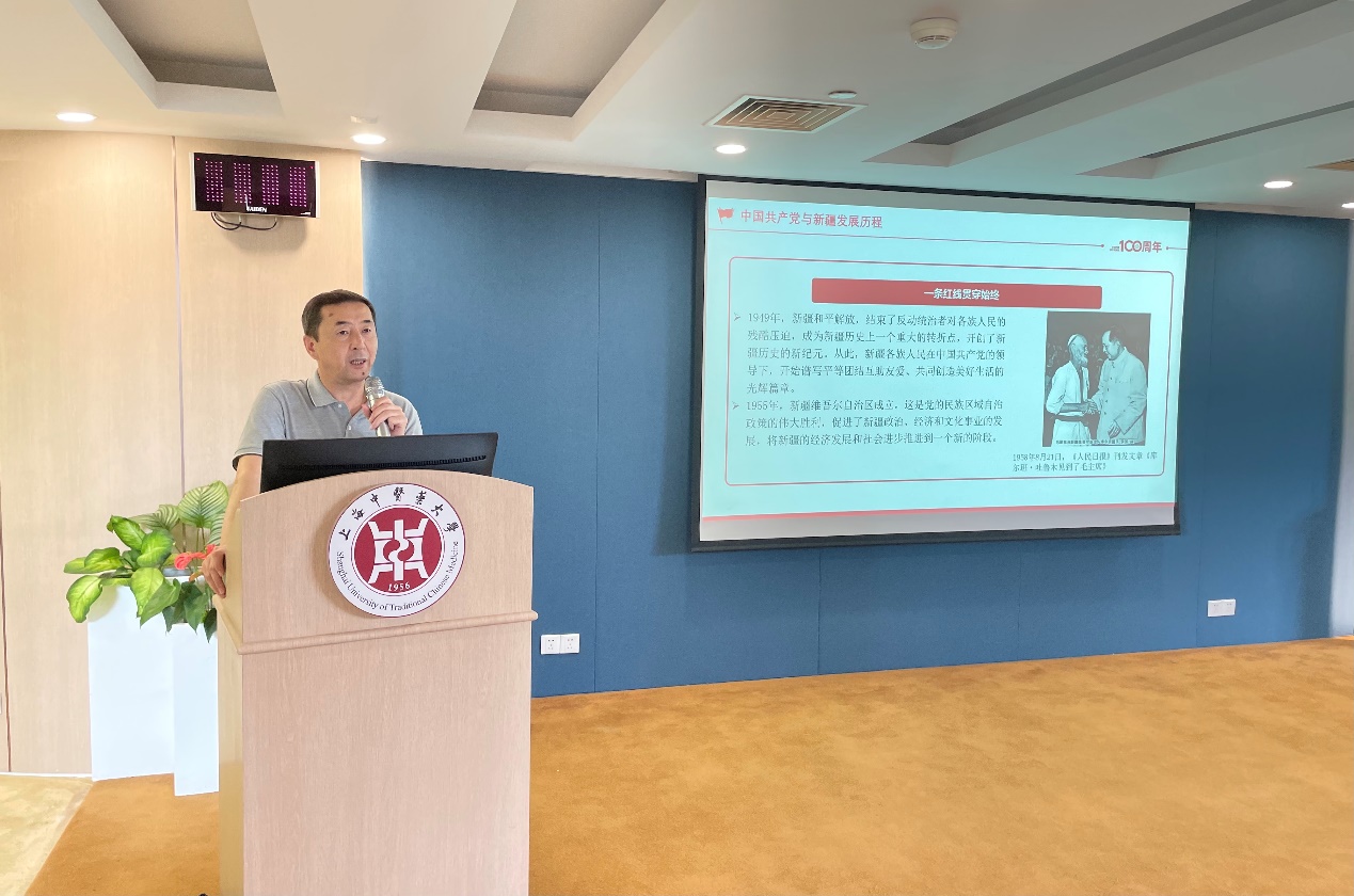 会上,上海市民族与宗教事务局民族一处副处长阿扎提以《建党百年与新疆建设发展》为题介绍党和国家在边疆建设和维护民族团结等方面做出的努力和取得的成绩。阿扎提的讲座围绕中国共产党与新疆发展历程、第二次中央新疆工作座谈会、新时代中国共产党的治疆方略三个部分展开,既有对史实的描述,又有对方针政策的介绍,同时结合学生们的亲身经历展开讲述,在场学生获益匪浅。