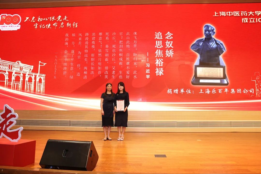 为献礼建党百年,共育中医药时代新人,活动中还举行“庆百年、共育人”捐赠仪式。上海乐百年健康产业集团,专门为学校制作了庆祝建党百年华诞纪念品。