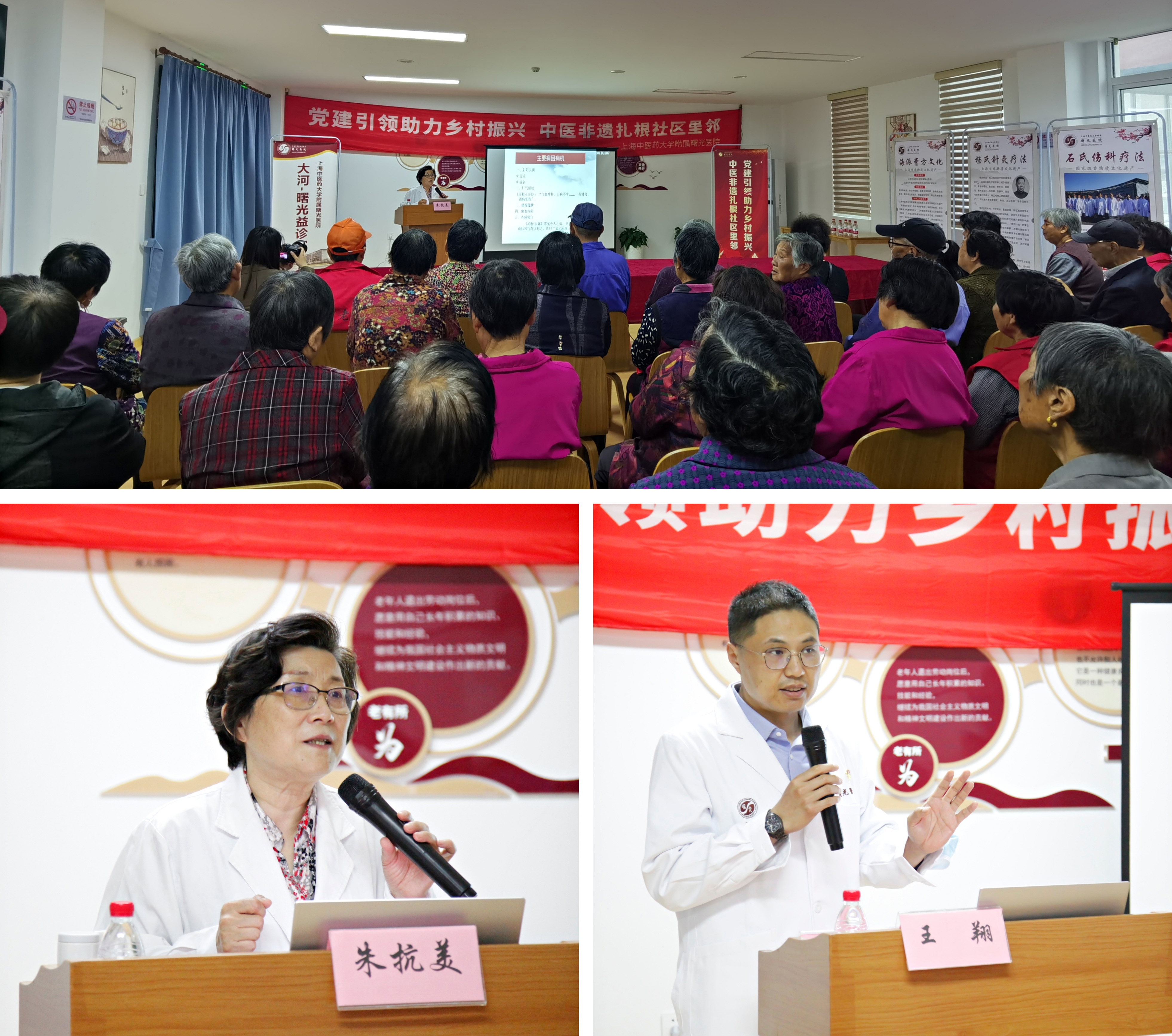 根据年度“健康菜单”的项目,“铭记”为民服务队每月派出不同专业的医疗专家和志愿者,前往距离曙光医院50公里外的老港镇大河村,为当地村民送上专家义诊服务和科普养生课堂,前来寻求健康咨询的村民络绎不绝。今年5月,服务队集结医院非遗项目“石氏伤科”“海派膏方”“夏氏外科”“杨氏针灸”“徐氏儿科”齐聚大河村,开展中医非遗进社区大型主题活动,把上海滩享有盛名的“百年老店”开到乡村、服务百姓,积极践行“非遗保护为了人民、保护成果人民共享”的文化理念,真正让群众享受到了非遗保护的成果。义诊专家涵盖内科、外科、儿科、针灸科、骨伤科等,回应乡村居民常见病、多发病的咨询就诊需求。现场还设有血压测量服务点、针灸非遗技法体验、香囊制作、中药识别、八段锦教学等丰富的传统中医药科普互动环节。“铭记”为民服务队以实际行动将“我为群众办实事”赋予更丰富的内涵,让中医传统文化在田间地头更接地气、更聚人气,受到了当地百姓的热烈欢迎和广泛认可。
