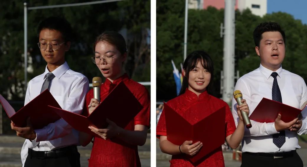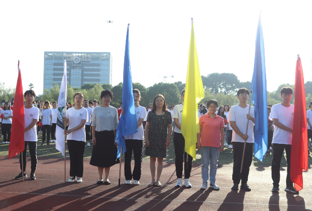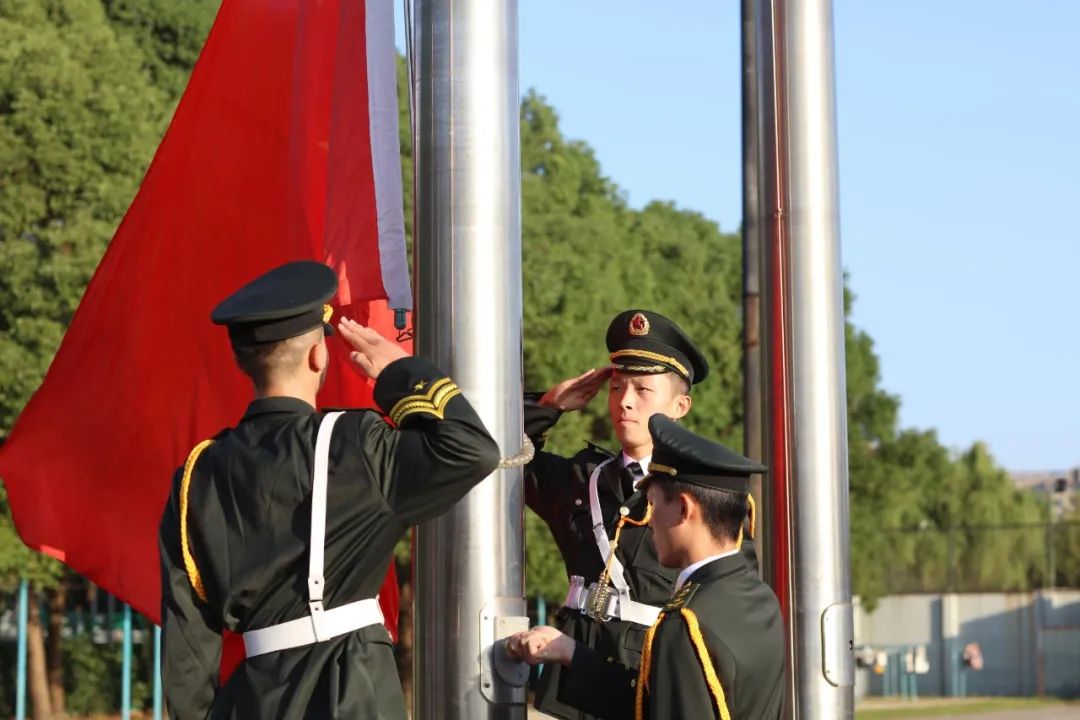 升旗仪式在中国人民解放军进行曲中拉开帷幕,国旗护卫队迈着整齐的步伐,意志坚定,目光炯炯。随着出旗令响,师生行注目礼,奏唱中华人民共和国国歌,鲜艳的五星红旗缓缓升起。