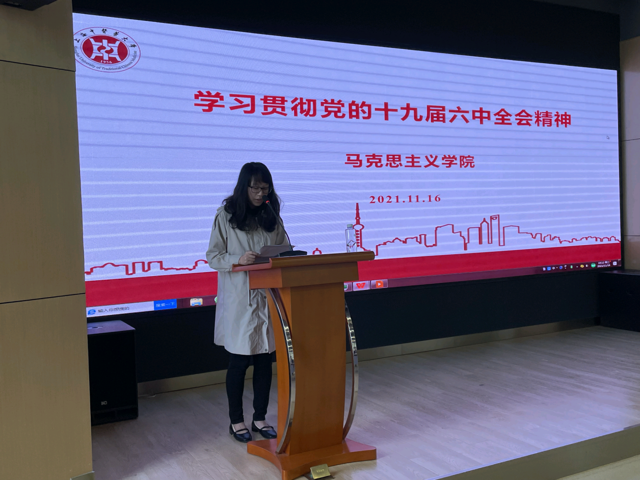 第一党支部陈荣武指出,为更好把握全会精神,一定要精读文本,决议对不同阶段思想成果分别用“创立”和“形成”来表述,这种用词的差异显示其所处发展阶段的区分。何兰萍重点谈了如何将决议中总结党百年奋斗经验中的“坚持胸怀天下”思想有机融入形势政策教学。