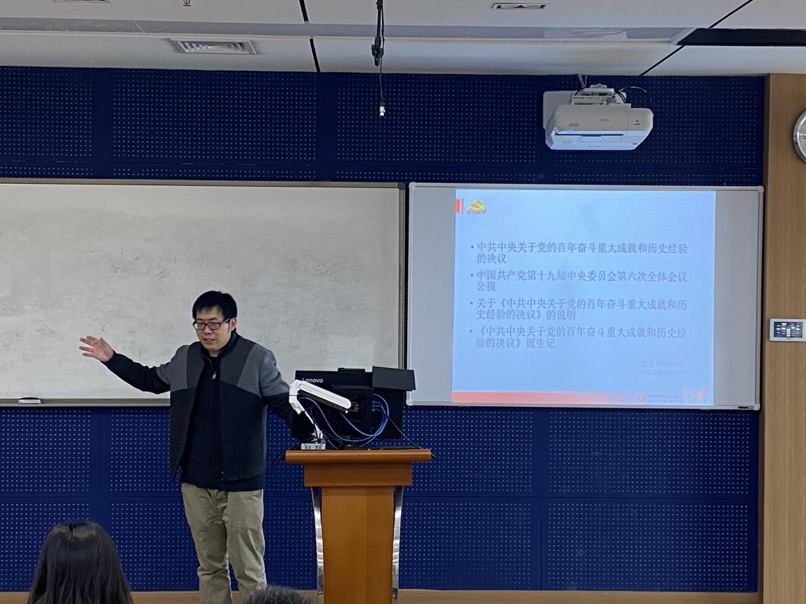 郑智鑫以阐述“学史明理是基础、学史增信是保障、学史崇德是动力、学史力行是目标”引出开展党史学习教育的重要性。为帮助师生领会党的十九届六中全会精神,他从理解第三个历史决议制定的重大意义、全面把握百年党史的历史进程和重大成就、深刻认识马克思主义中国化的三次飞跃和系统总结党的百年奋斗的历史意义和经验四个方面开展解读。他表示,要更加紧密地团结在以习近平同志为核心的党中央周围,以史为鉴、开创未来,埋头苦干、勇毅前行,为实现第二个百年奋斗目标、实现中华民族伟大复兴的中国梦而不懈奋斗。