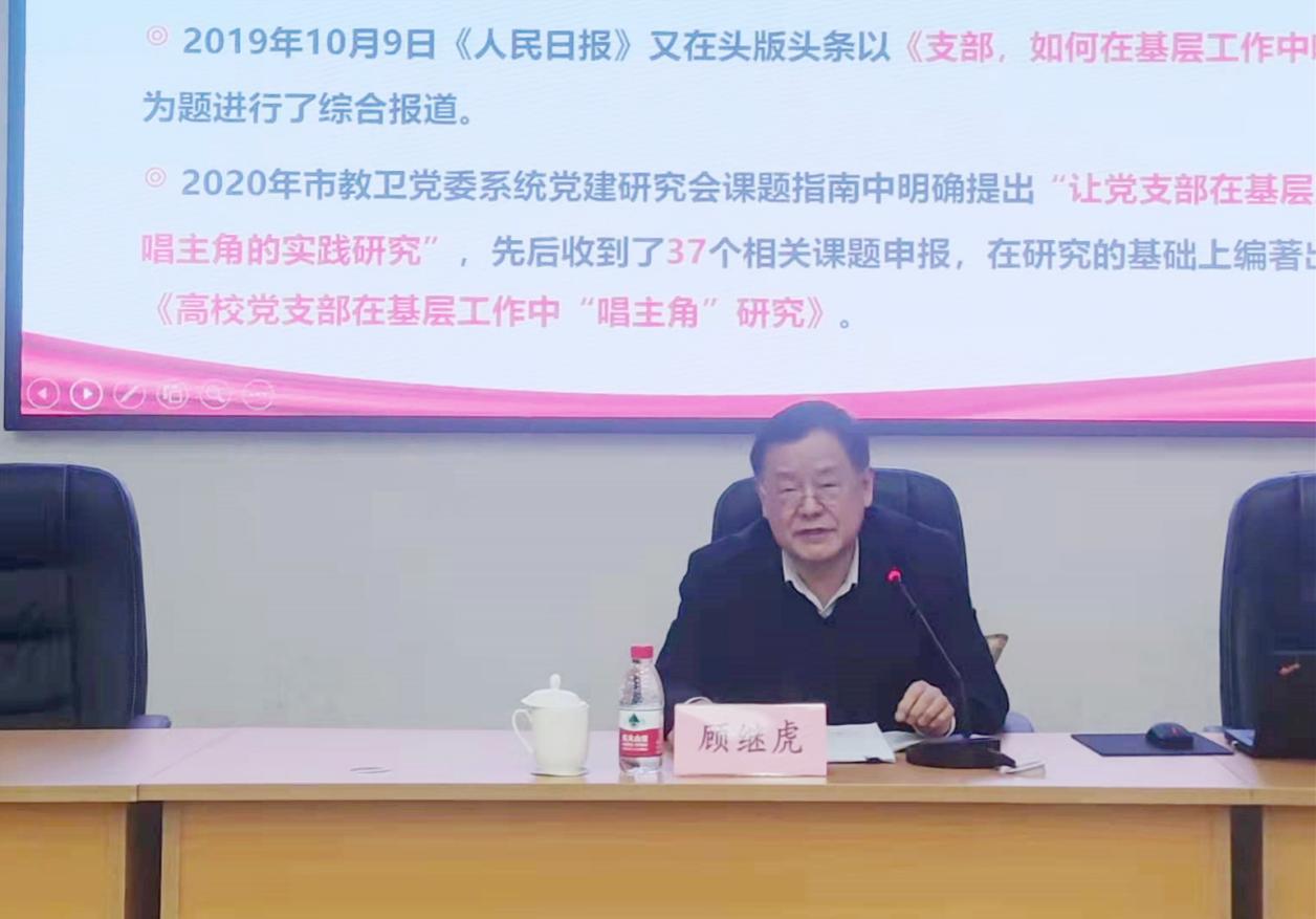 12月10日上午,上海市教卫工作党委党建研究会顾问顾继虎带来《让党支部在基层工作中“唱主角”的思考》讲座。顾继虎强调,要树立“主角”意识,坚持党建工作与中心工作深度融合,在基层工作中敢于、善于“唱主角”。