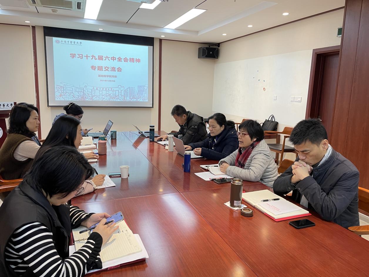 12月28日上午,基础医学院学院党政班子召开学习党的十九届六中全会精神专题交流会,会议由学院党委书记夏文芳主持。校党史学习教育指导组第五组副组长、校党委宣传部(教师工作部)副部长刘虹到会指导。
