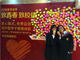 “致青春,致校园——2016年毕业季”、“爱心甜点免费品尝——祝福中医学子甜蜜起航”面包房内大幅宣传板前吸引了大批同学驻足合影,取张五彩的爱心贴纸,写下深情的毕业祝福,尝口酥蜜的泡芙甜点,一张张温馨的笑脸化为了毕业季最难忘的瞬间!