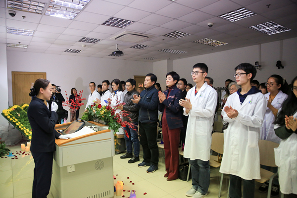 活动特别邀请了“80后”医学博士黑子明,他不仅是临汾社区卫生中心的全科医生,还是一位临终关怀科医生。他与师生们探讨了临终关怀、生命价值等话题。随后,遗体捐献者家属李豪先生讲述了其父亲李继先、母亲陈荣恩在金婚纪念之时,双双办妥遗体捐献手续的感人故事,向师生们传递了一对普通夫妇的大智大爱。最后,现场还举办了一场遗体捐献者的追思会,表达了我校师生们对“大体老师”的感恩和敬重。