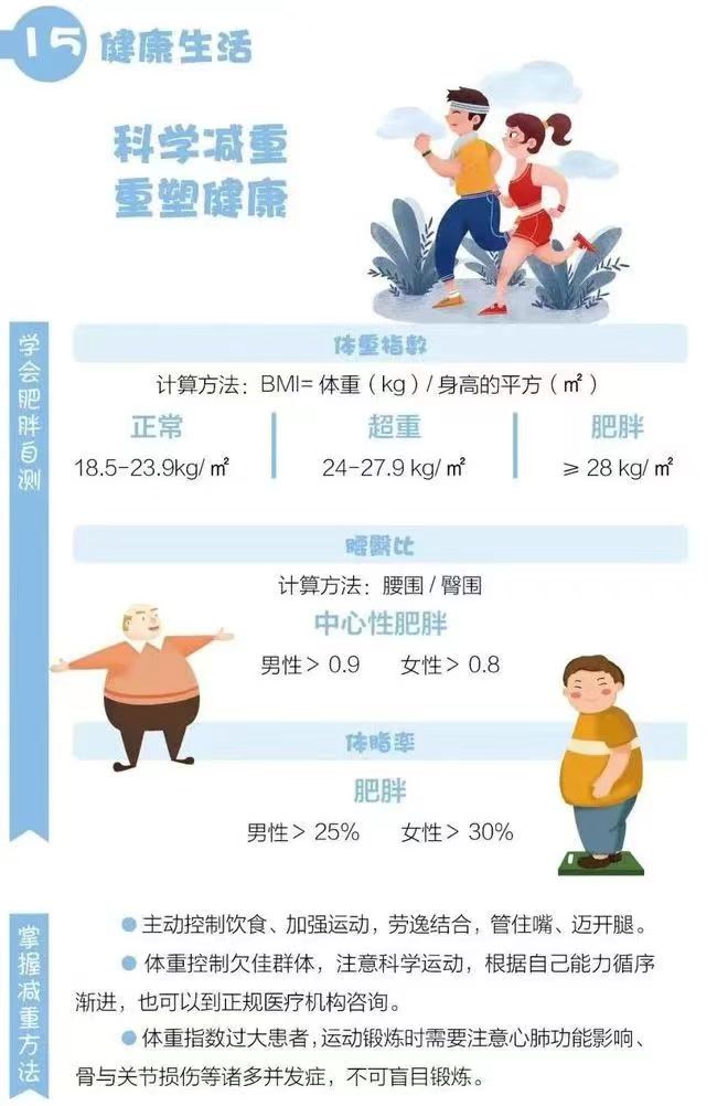 体重指数BMI=体重/身高的平方(国际单位kg/㎡) ,应控制在24 以下,老年人可适当放宽,控制在 26 以下。