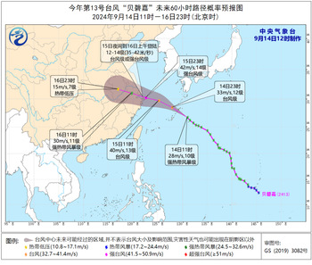 根据气象部门通知,今天11时,今年第13号台风“贝碧嘉”位于距离浙江省舟山市东偏南方向约930公里的洋面上,中心附近最大风力10级(28米/秒),强度维持强热带风暴级。预计“贝碧嘉“将以每小时30-35公里速度向西偏北方向移动,强度逐渐加强,14日傍晚到夜间穿过琉球群岛移入东海东部海面,15日上午逐渐转向西偏北行,向华东沿海靠近,并将于15日夜间到16日上午在浙北到上海一带登陆,登陆强度为台风级或强台风级,登陆后强度逐渐减弱。