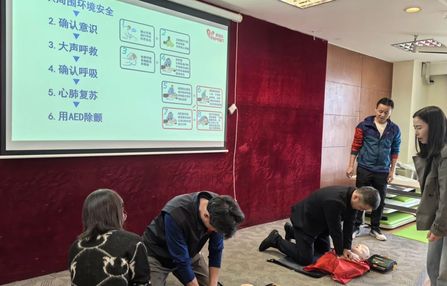 本次课程邀请了上海市爱众应急救助促进中心的老师以理论结合实操的授课方式,讲解心肺复苏(CPR)的步骤要点和自动体外除颤器(AED)的使用规范。