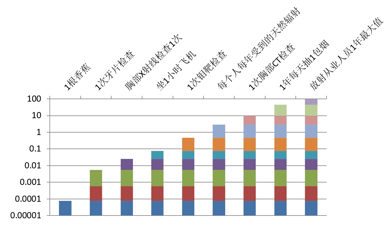 回到开头说的“5000根香蕉辐射”的话题,其实何止是香蕉,我们平时的生活环境中也存在着辐射(所以不能抛开剂量谈效果,咱香蕉不背这个锅哈)。我们一般采用毫西弗(mSv)来衡量辐射的危害性。根据联合国原子辐射效应科学委员会的报告显示:全球平均每人每年接受到来自天然本底的辐射剂量为2.4mSv,约等于吃了3万根香蕉。做一次钼靶检查约为0.4mSv,相当于日常生活2个月所受到的天然辐射,或者是上海飞纽约5次所受到的辐射剂量。如果每天吸一包烟,每年受到的辐射剂量约为35mSv,远远高于很多医疗辐射剂量。下图是一些日常生活中常见的辐射类型与1根香蕉的辐射量对比: