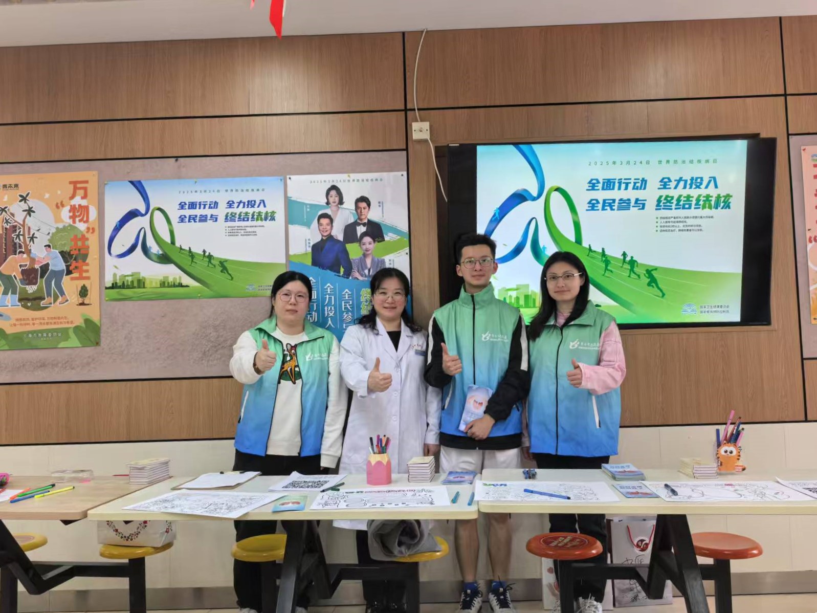 2025年3月24日,在第30个世界防治结核病日到来之际,后勤保障处健康管理服务科(门诊部)与张江社区卫生服务中心和公共健康学院联动,以"Yes! We Can End TB: Commit, Invest, Deliver(是的!我们可以终结结核病流行:承诺、投入、行动)"为主题,在学生食堂一楼大厅开展“世界防治结核病日”宣传活动。